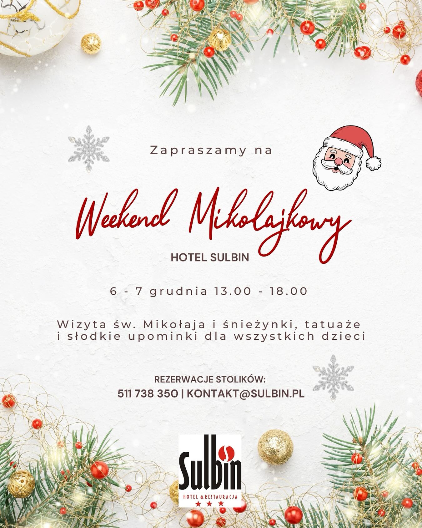 Rezerwacje stolików: 511 738 350 lub kontakt@sulbin@pl